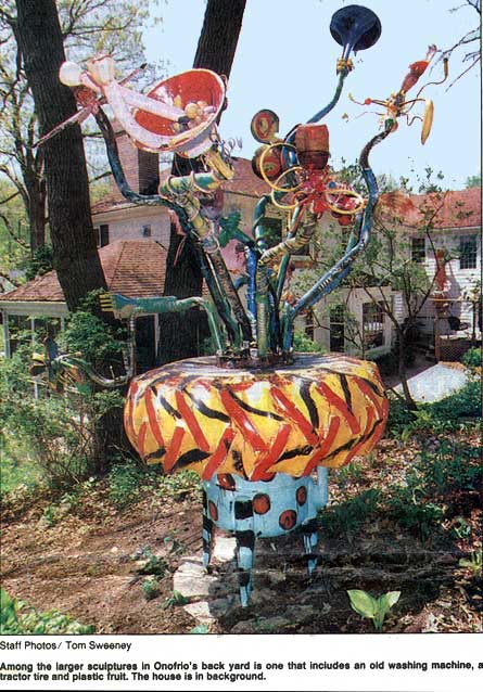 It's; Onofrio's particular talent to see such potential in stuff that other5 discard as trash. That's what lures her to garage sales and junk shops and prompts her to fill the garage with boxes and barrels of neatly sorted discards of every sort. Gallon buckets of white buttons, gallon buckets of black buttons, stacks of decorative tin religious plates, rolls of garden hose, tubs of Jell-O molds, belt buckles, pencils, candlesticks, perfume bottles.