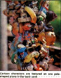 The Garden of Eden as a place of innocence and desire is a recurrent theme in the museum show. ln a wall sculpture called "Temptation," a pearl-encrusted deer gazes at a beaded apple dangling from the In a neck of a snake. In a frieze titled "Call Me Anytime," a lusty bear dangling a telephone receiver is surrounded by leering faces. (She uses taxidermists' plastic-foam models as bases for her animal heads.)